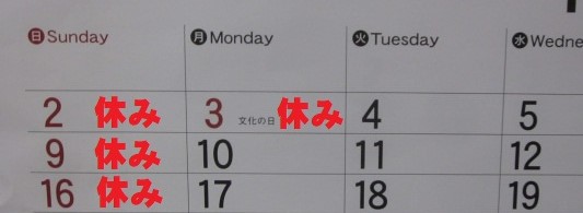 明日 日曜日と文化の日は定休日です。