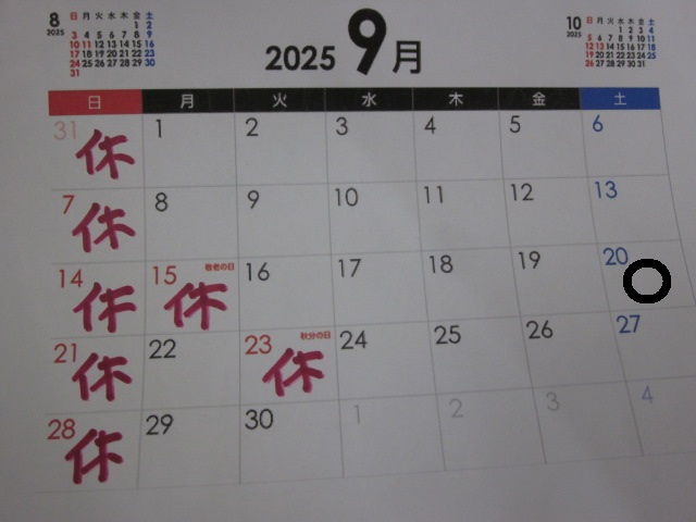 9月20日 土曜日 夕方5時まで営業中 日曜日は定休日です。